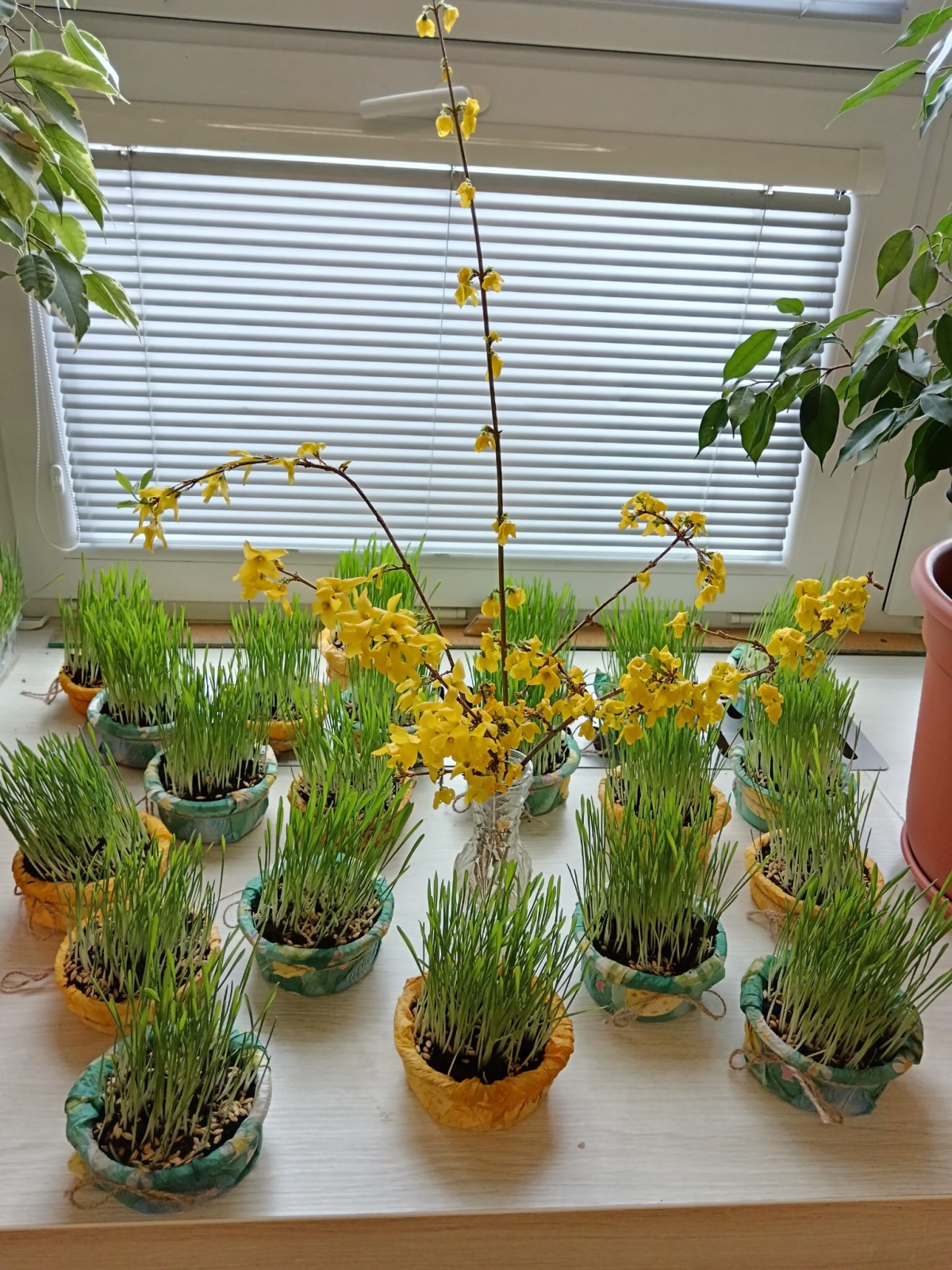 Další jarní aktivitou bylo zasévání velikonočního osení. Každý si zasadil vlastní mističku a s nadšením sledoval, jak ze semínek postupně vyrůstají zelená stébla. Osení jsme následně ozdobili barevnými vajíčky a papírovými zajíčky, čímž jsme si vyzdobili třídu a navodili pravou velikonoční atmosféru.