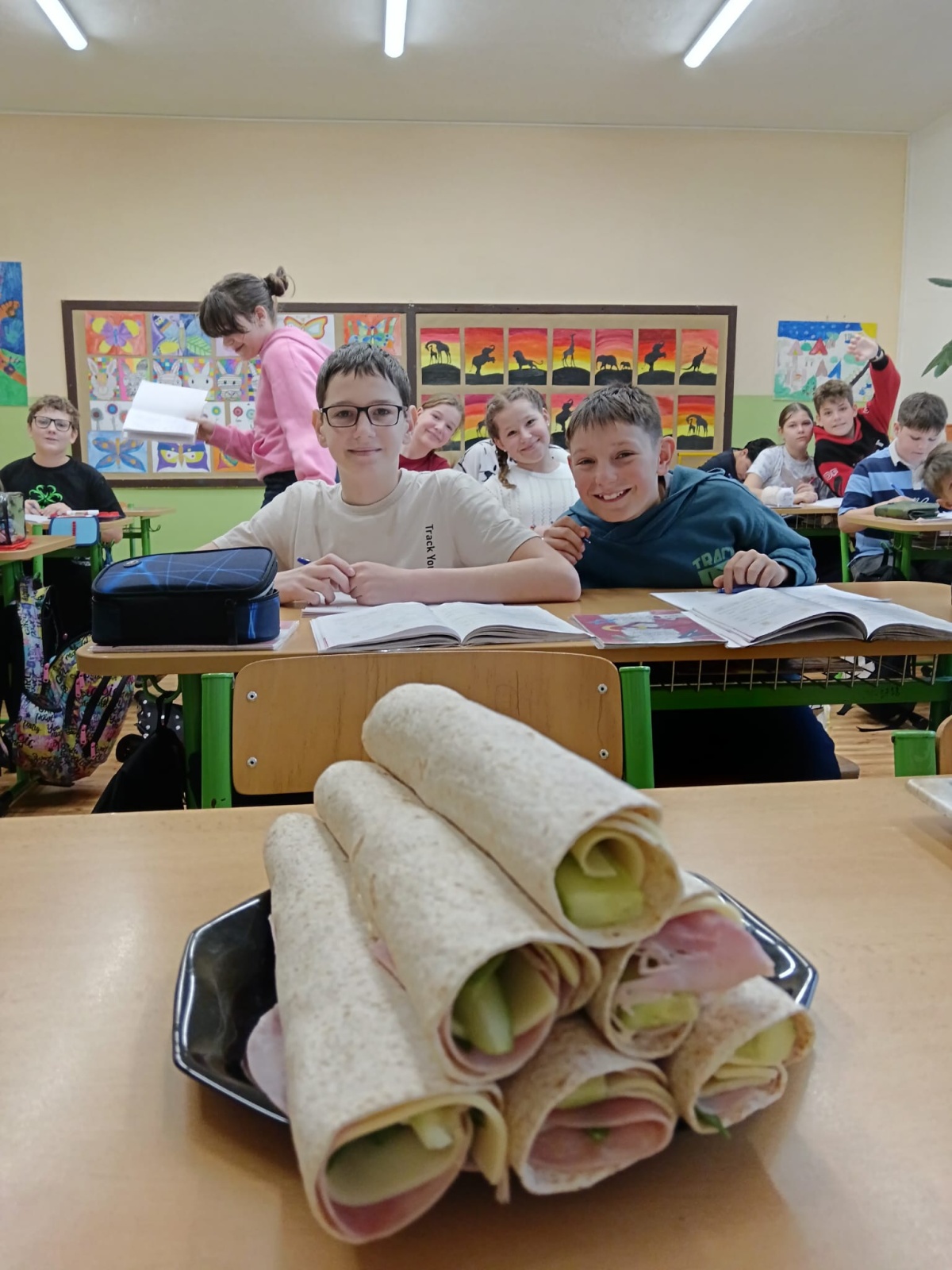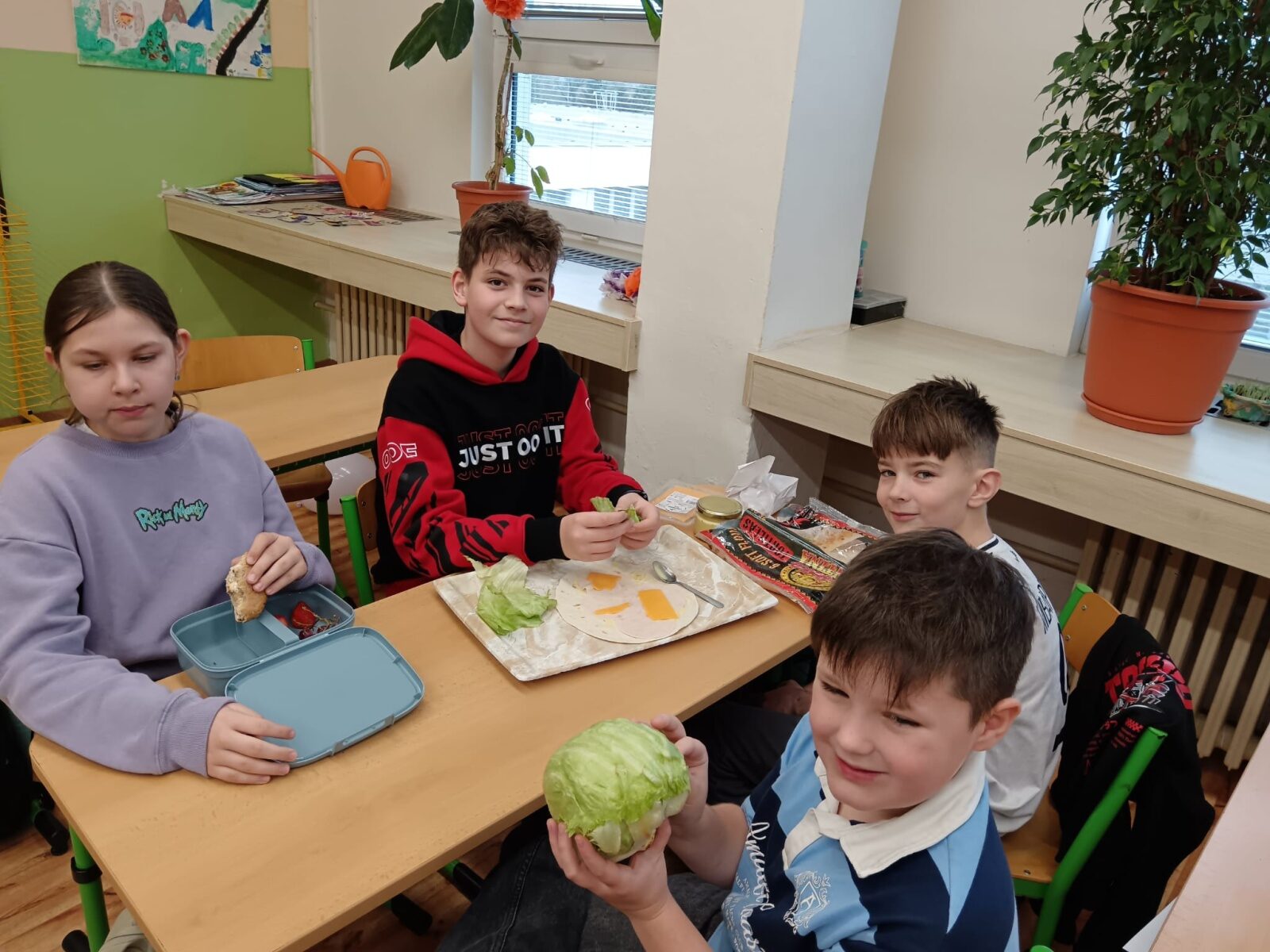 Jednou z nejoblíbenějších činností byla společná výroba zdravých tortill. Každý žák si mohl připravit vlastní kombinaci podle chuti – někdo zvolil klasiku v podobě šunky a sýra, jiní dali přednost čerstvé zelenině či ovoci. Velký úspěch sklidila také varianta s medvědím česnekem, který krásně voněl a dodal jarní chuť. Děti si tak nejen pochutnaly, ale zároveň si připomněly zásady zdravého stravování.